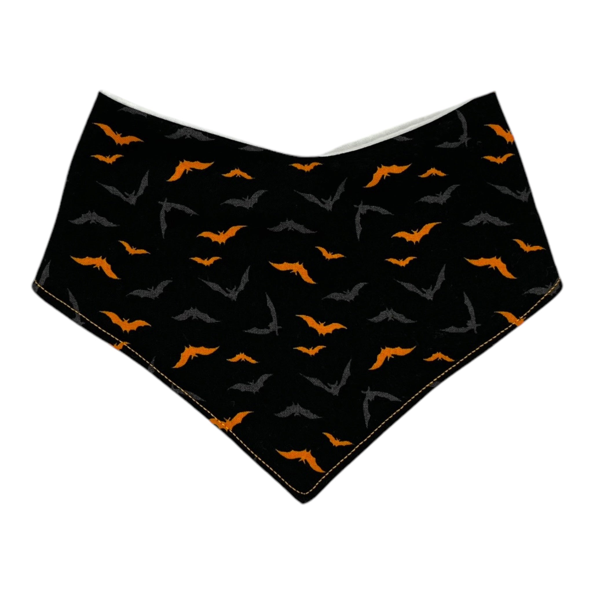 This Bandana Bib by Mimi's Little Loveys is designed to keep drooling little ones dry without sacrificing style. The front features a swarm of orange and gray bats on a black background - perfect for Halloween! It's backed in a soft, absorbent, coordinating flannel.