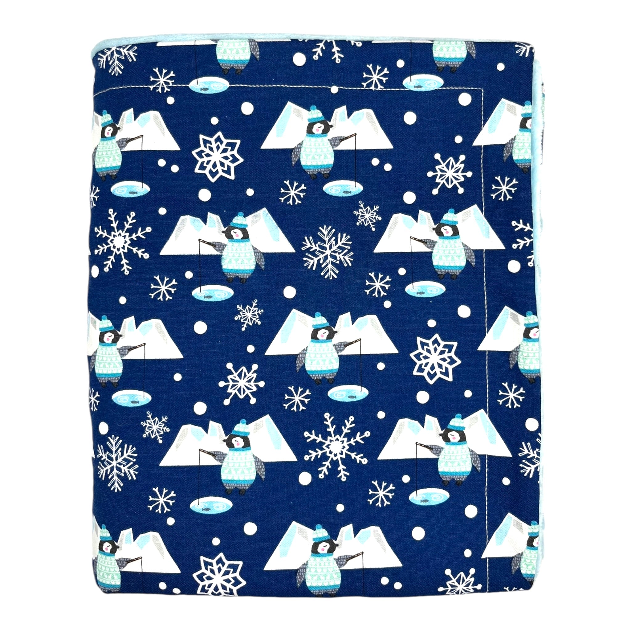 Baby and kids blue blanket with penguins fishing, icebergs, and snowflakes.