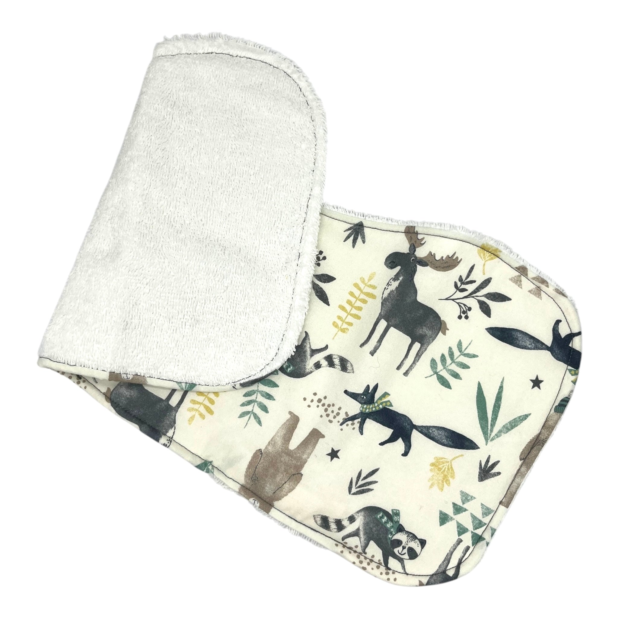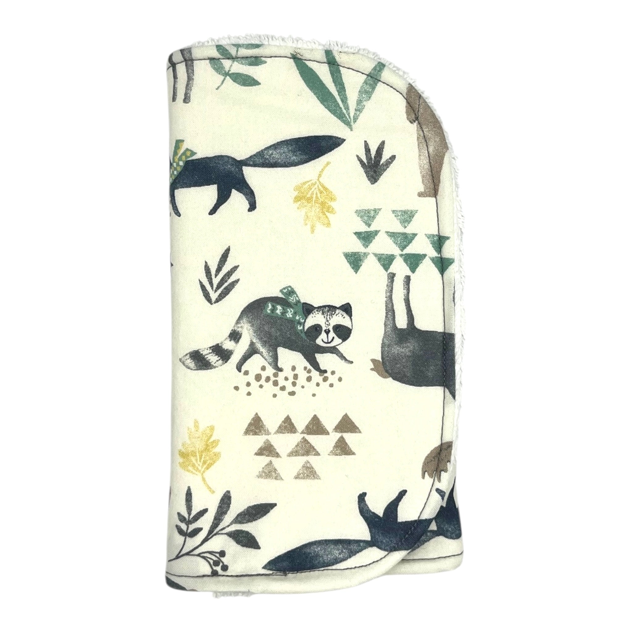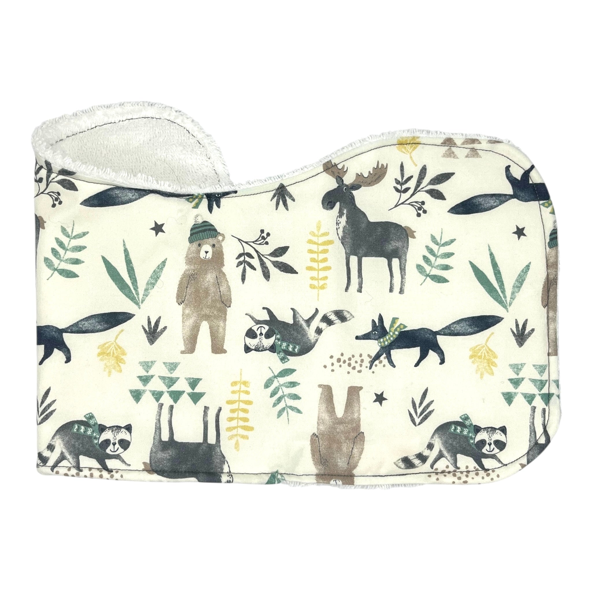 Our Burp Cloths are designed with practicality and today's modern, busy lifestyles in mind. The front features a collection of Maine critters: bears, cardinals, deer, moose, owls, porcupines, raccoons, squirrels, all on a white background. It's backed with a high-quality, white, terry cloth.