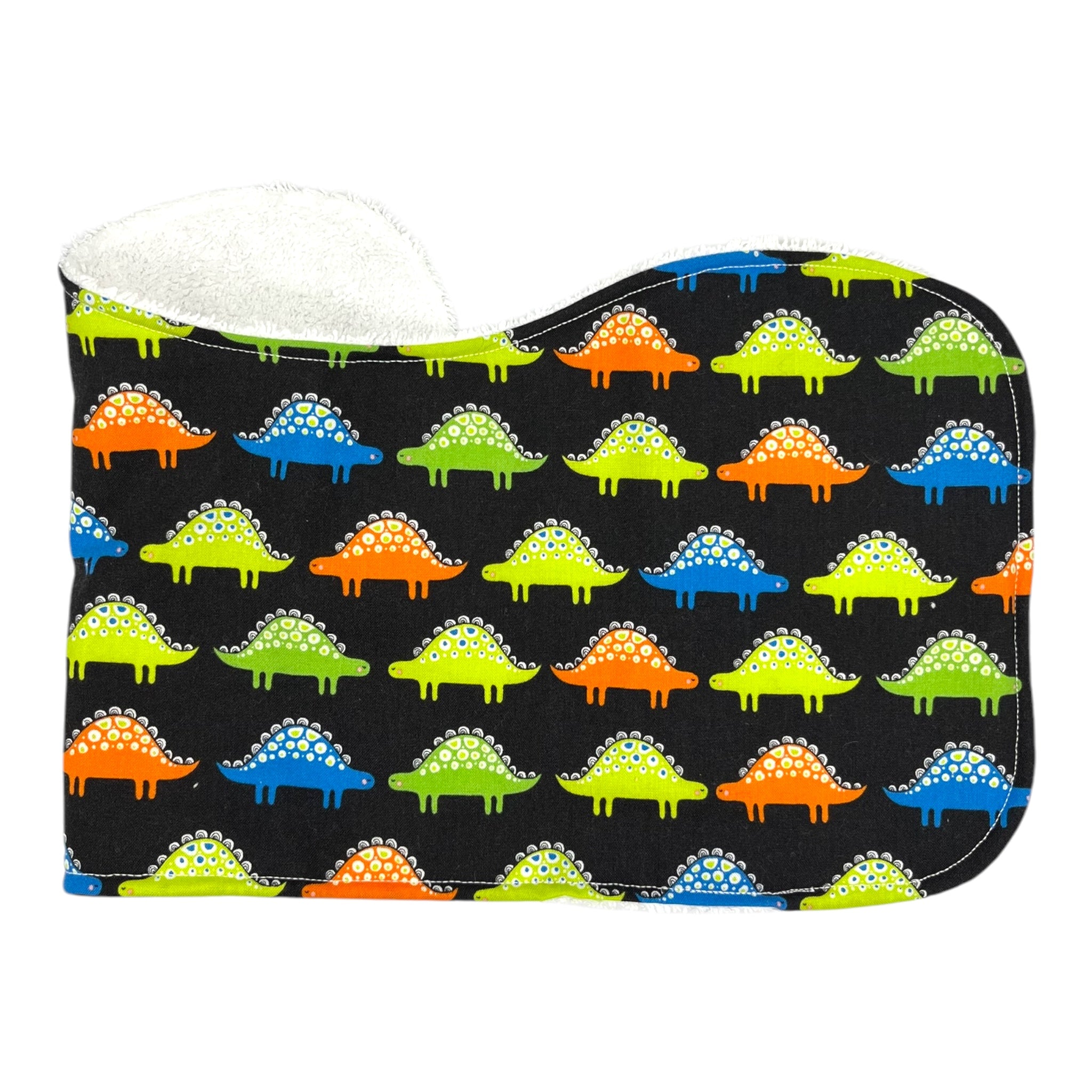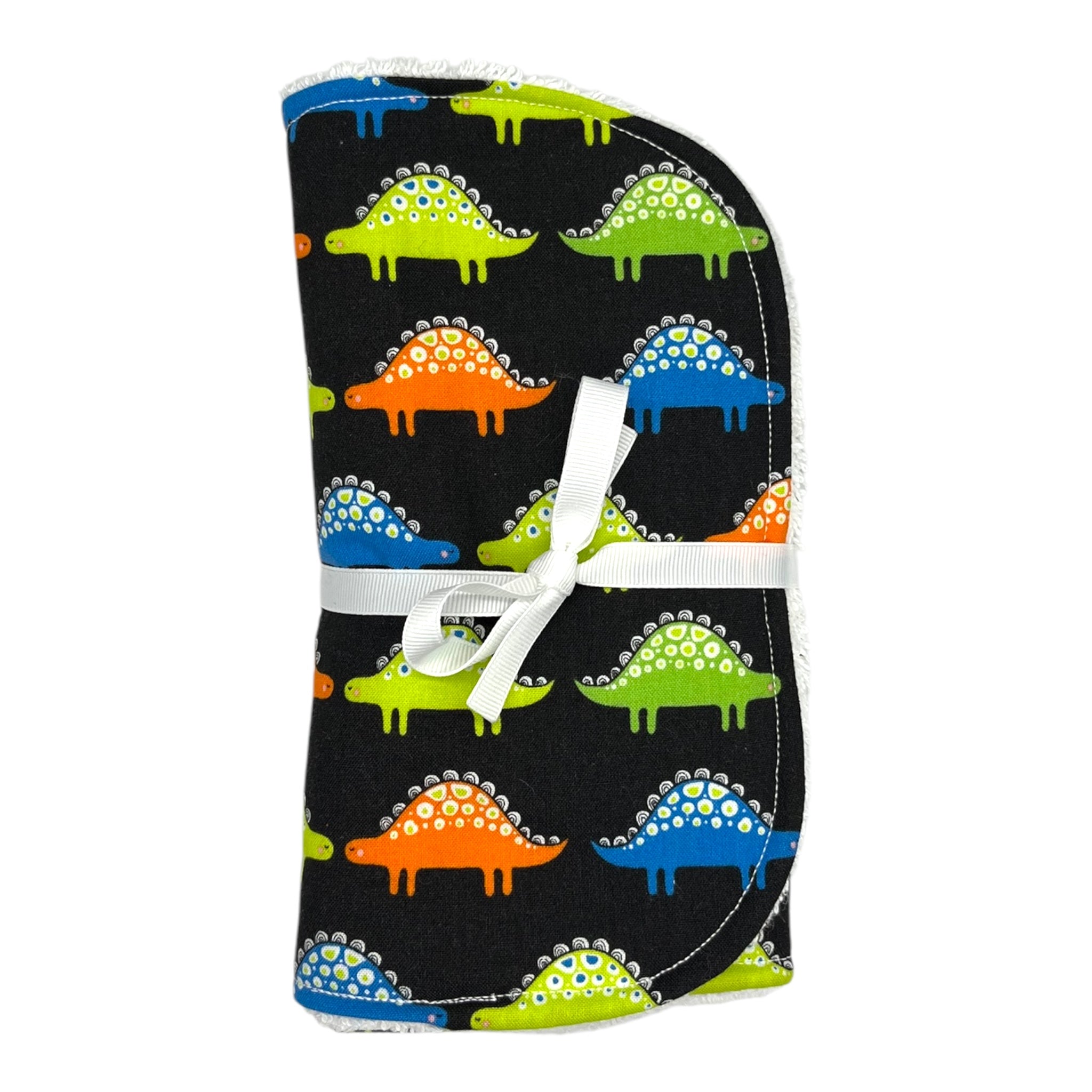Our Burp Cloths are designed with practicality and today's modern, busy lifestyles in mind. The front is a bright, fun, dinosaur print in blue, green, and orange on a black background. They're backed with a high-quality, white, terry cloth.