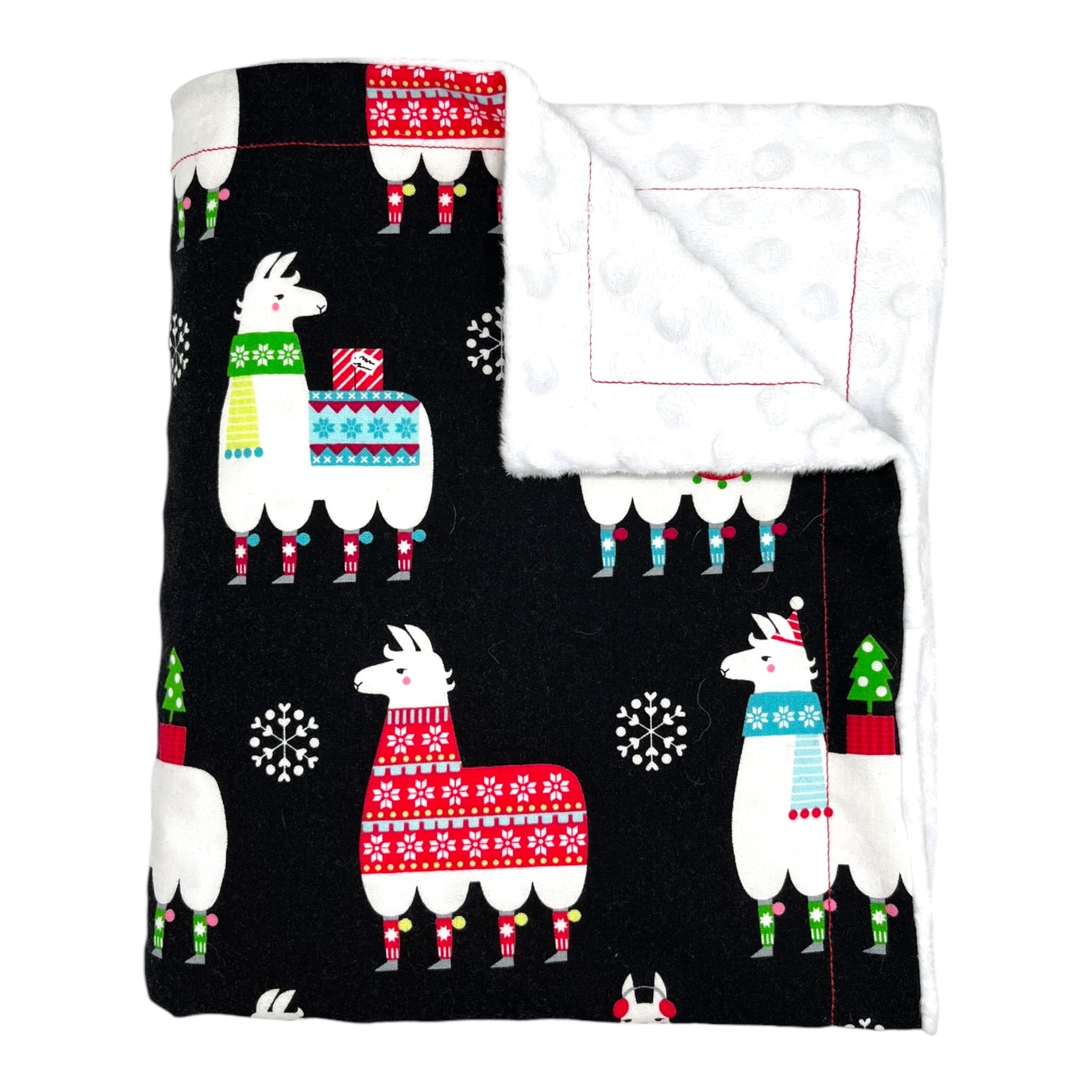 This Blanket by Mimi's Little Loveys features festive llamas in sweaters and scarves getting ready for the holidays, all adorning a black cotton front. The back is an ultra-soft, dimple-dot minky that your little one is sure to love. Choose from our oversized Stroller Blanket, measuring approximately 42 x 40 inches, or our smaller Cuddle Blanket, measuring approximately 30 x 30 inches. Please indicate which size you would like when ordering, and your blanket will be custom made for you.