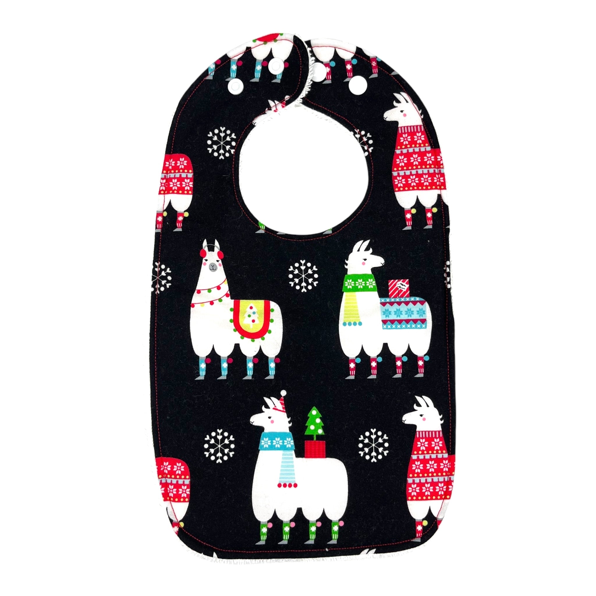 Our Everyday Bib by Mimi's Little Loveys is the bib you can reach for to use again and again, from baby's first solids through toddlerhood. Designed to be both stylish and practical, these bibs are soft and absorbent without being bulky. The black cotton front features festive llamas in sweaters and scarves getting ready for the holidays. It's backed with a high-quality, white, terry cloth.