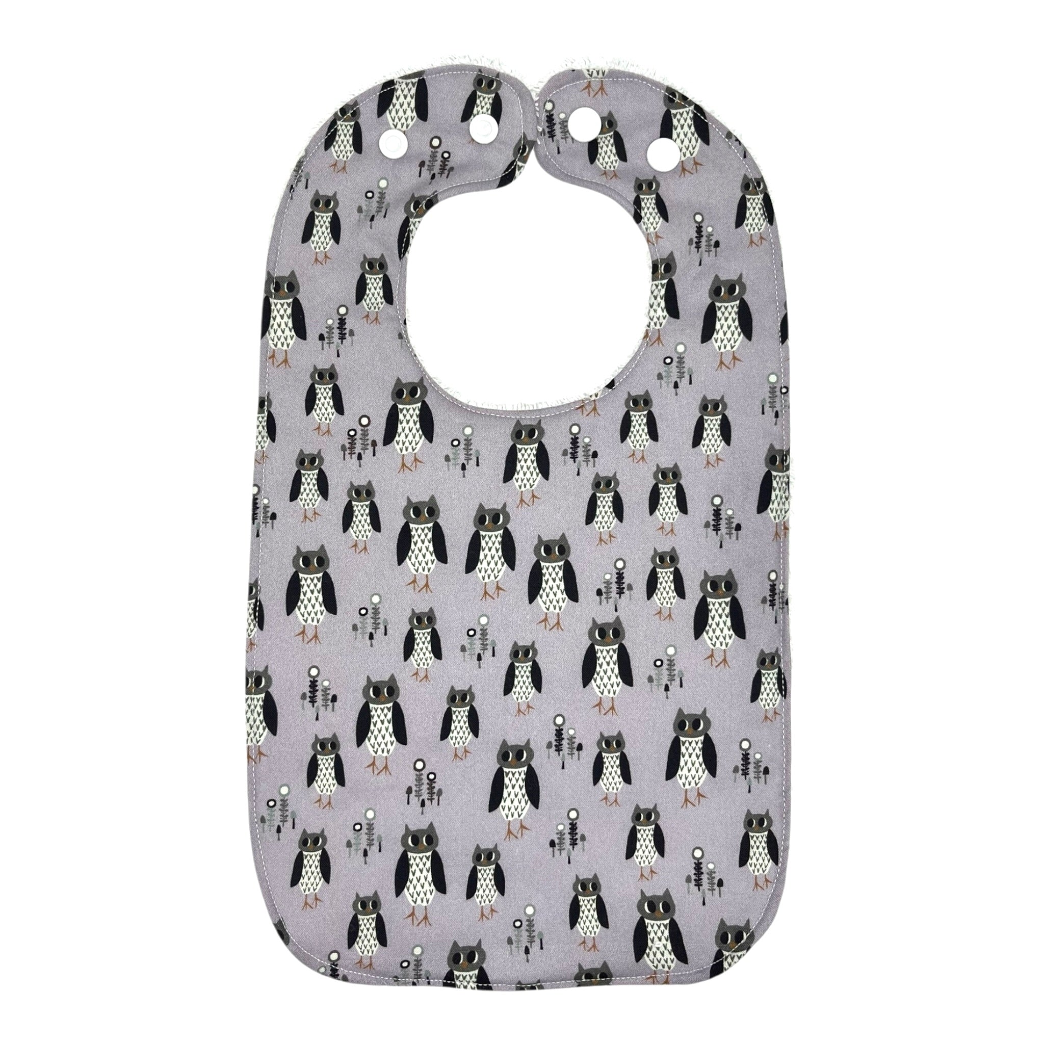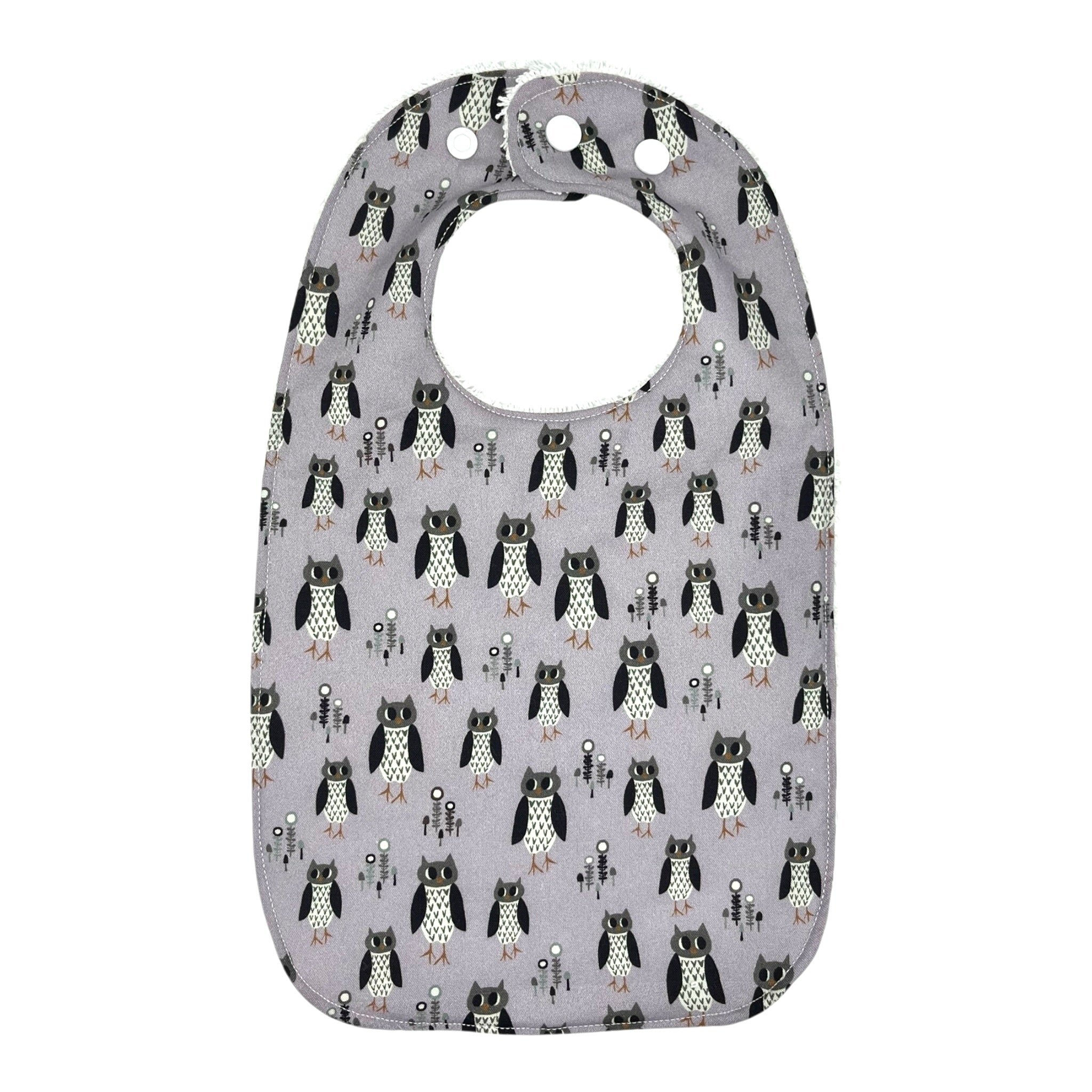 Our Everyday Bib by Mimi's Little Loveys is the bib you can reach for to use again and again, from baby's first solids through toddlerhood. Designed to be both stylish and practical, these bibs are soft and absorbent without being bulky. The front is a hoot, with fun owls on a light purple background. This bib is backed with a high-quality, white, terry cloth.