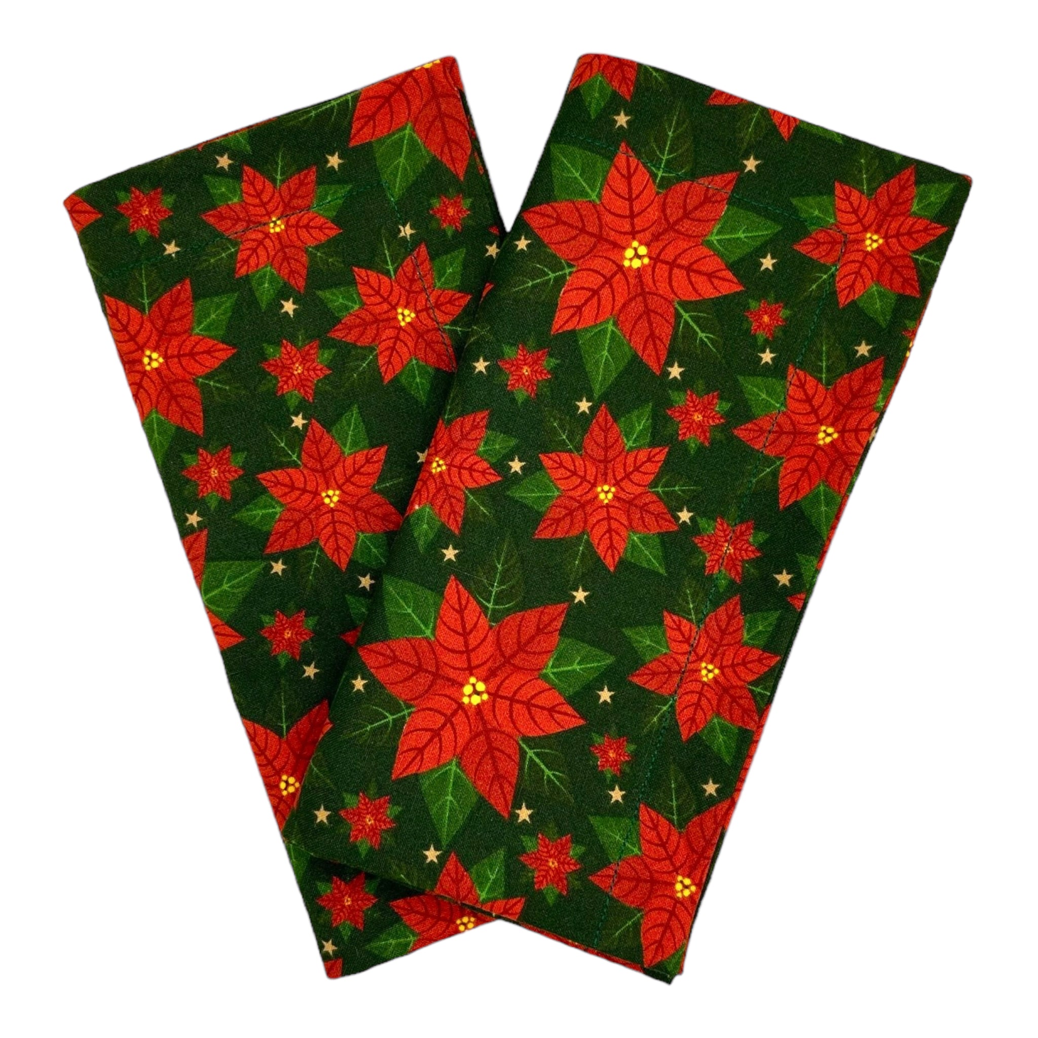 A pair of cotton napkins with red poinsettias on a green background.