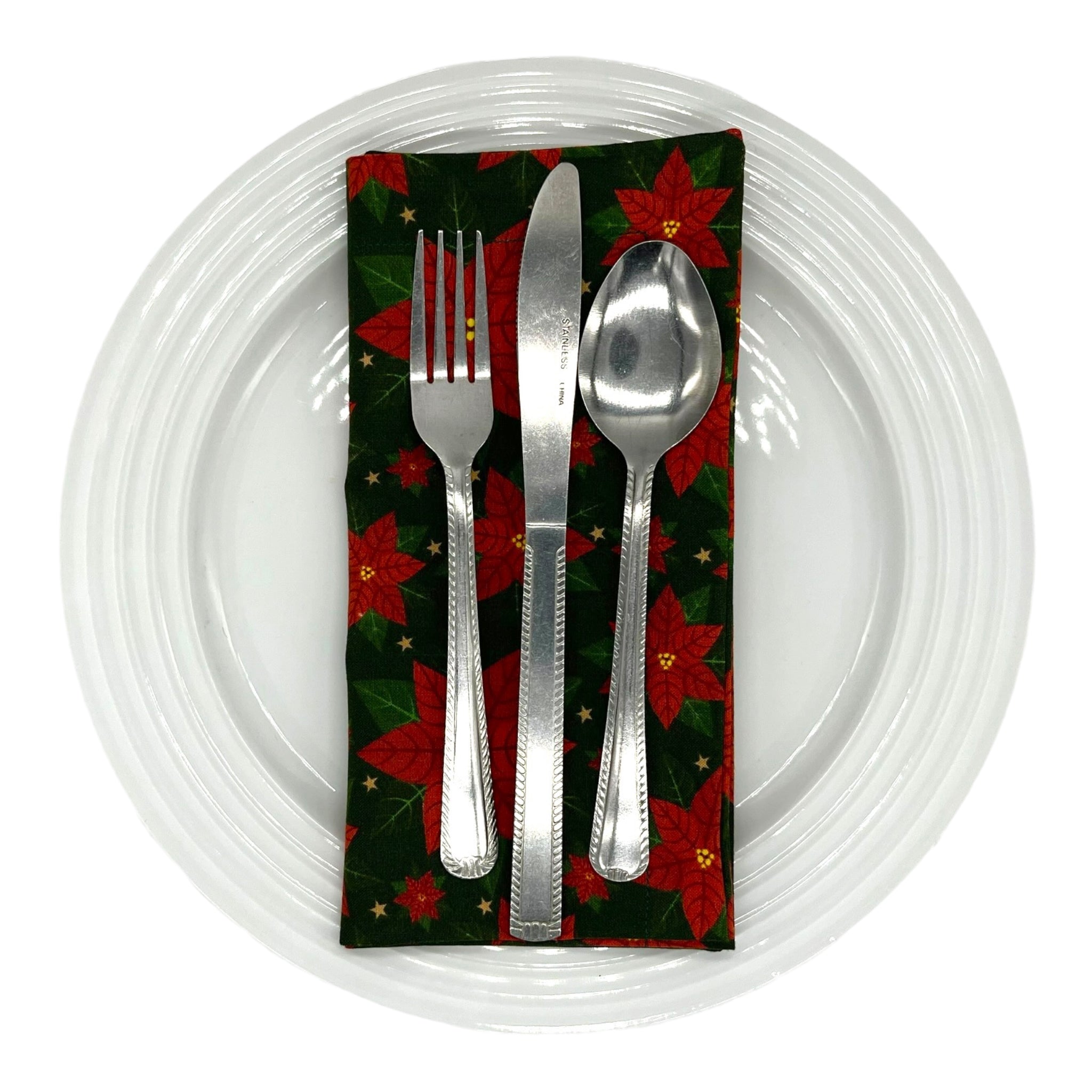 A folded cotton napkin with red poinsettias on a green background, as a place-setting with a plate and cutlery.