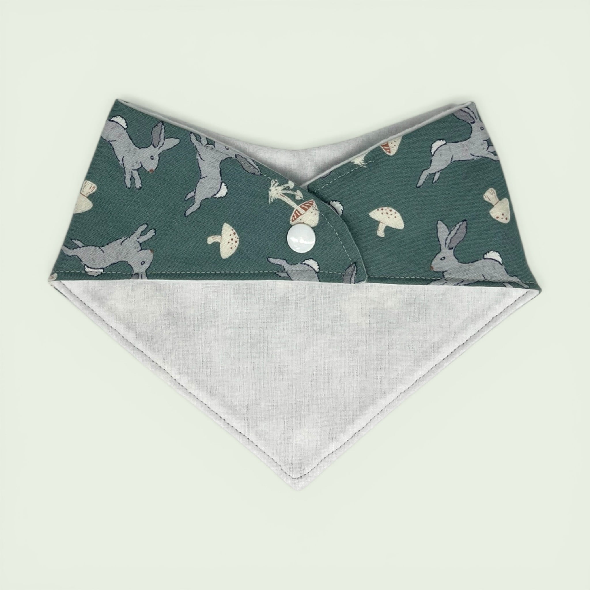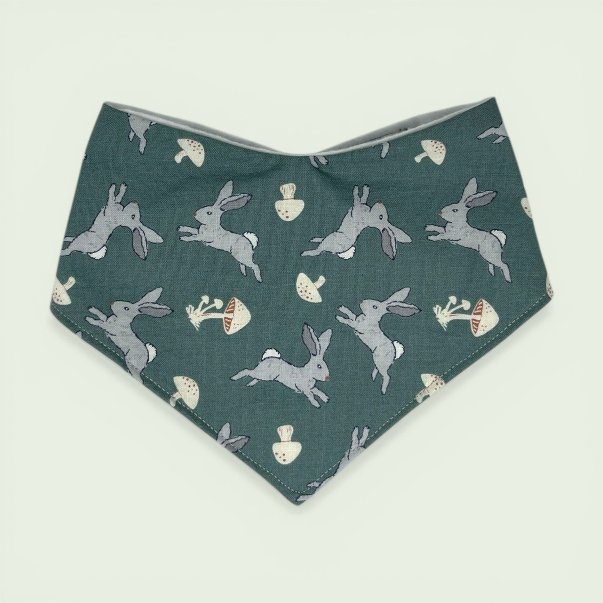 Baby bandana bib with rabbit and mushroom pattern on a teal background