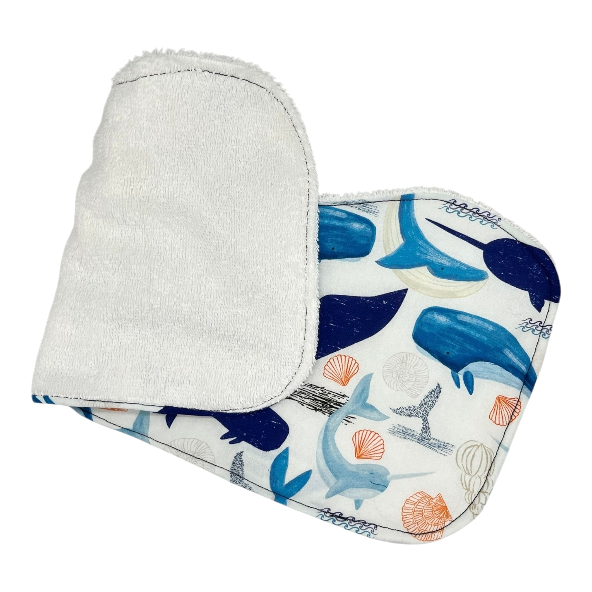 Our Burp Cloths are designed with practicality and today's modern, busy lifestyles in mind. The fronts feature a pod of assorted whales in shades of blue on a white background. They're backed with a high-quality, white, terry cloth.