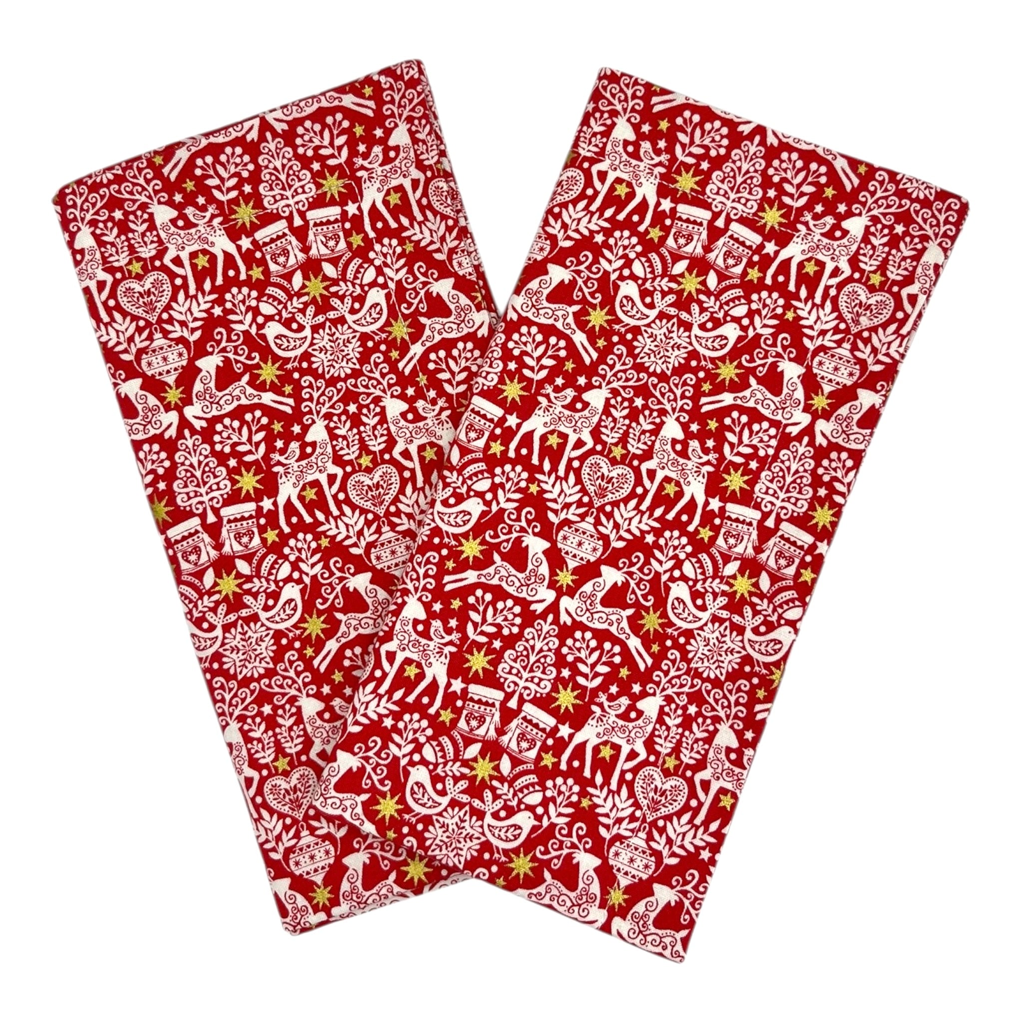 Dinner Napkins by Mimi's Little Loveys are a treat for your everyday table as well as your special guests. As durable as they are beautiful, these napkins will become your own household staples, as well as the gift you give again and again. These Dinner Napkins are an Elegant, Scandinavian design, featuring reindeer, birds, Christmas ornaments & stockings, in white, with gold stars, on a red background.