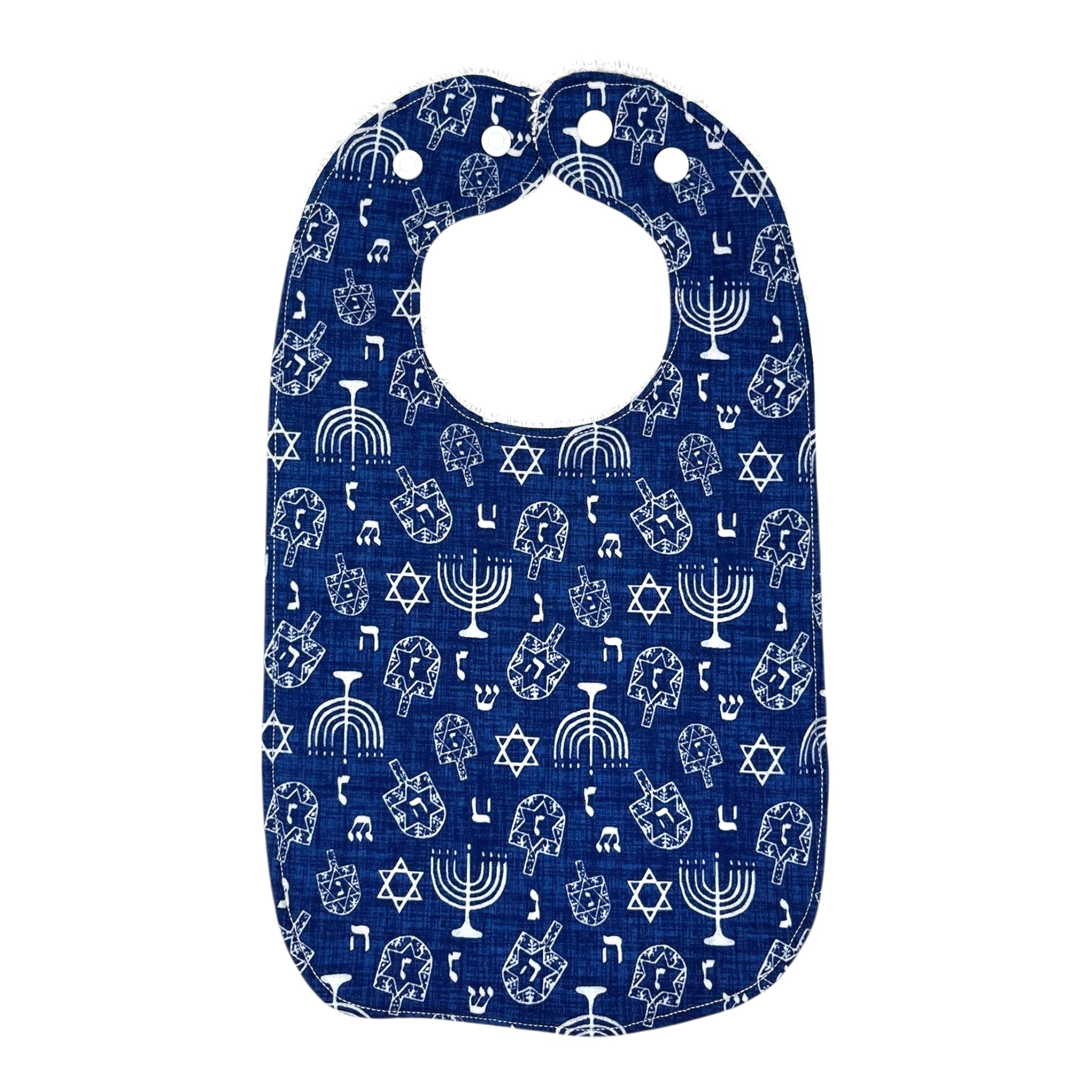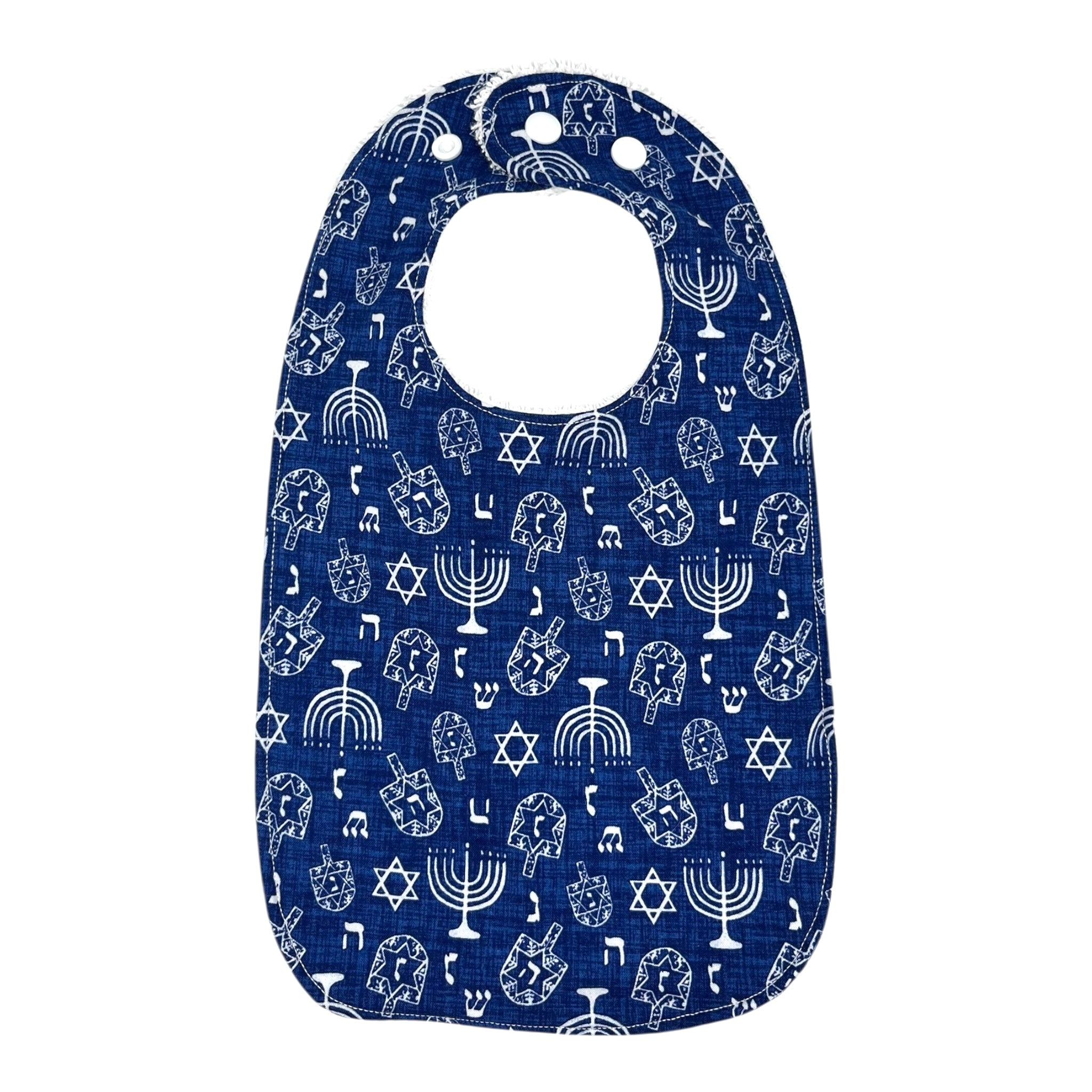 Our Everyday Bib by Mimi's Little Loveys is the bib you can reach for to use again and again, from baby's first solids through toddlerhood. Designed to be both stylish and practical, these bibs are soft and absorbent without being bulky. The front features dreidels, menorahs, and Stars of David, on a blue background. It's backed with a high-quality, white, terry cloth.